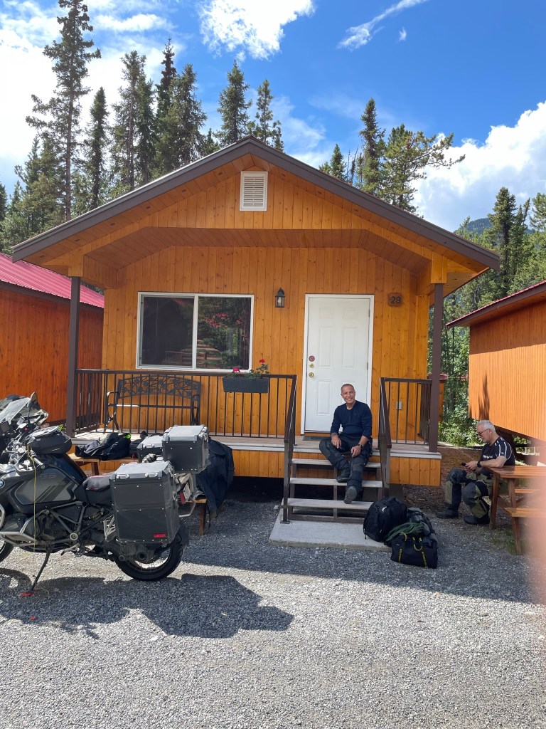 We leave Muncho Lake talking about distance for the day. We can push on to Whitehorse, and have a day completely off the bikes on Sunday, or just split the difference with two lighter days. We have to hold in Whitehorse to change tires for the gravel roads ahead, and the dealership opens Monday. We decide to push to Whitehorse, and are treated to an accommodating front desk person, a large room and a day off. Laundry, walking and relaxing are in order. Of course, even rest days include stretching and exercising. When you have as many years behind you as we each have, you must ward off the gremlins before they take hold. Total miles: 4780