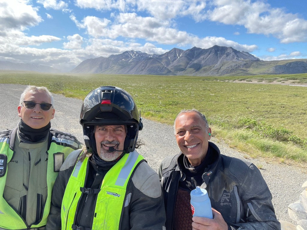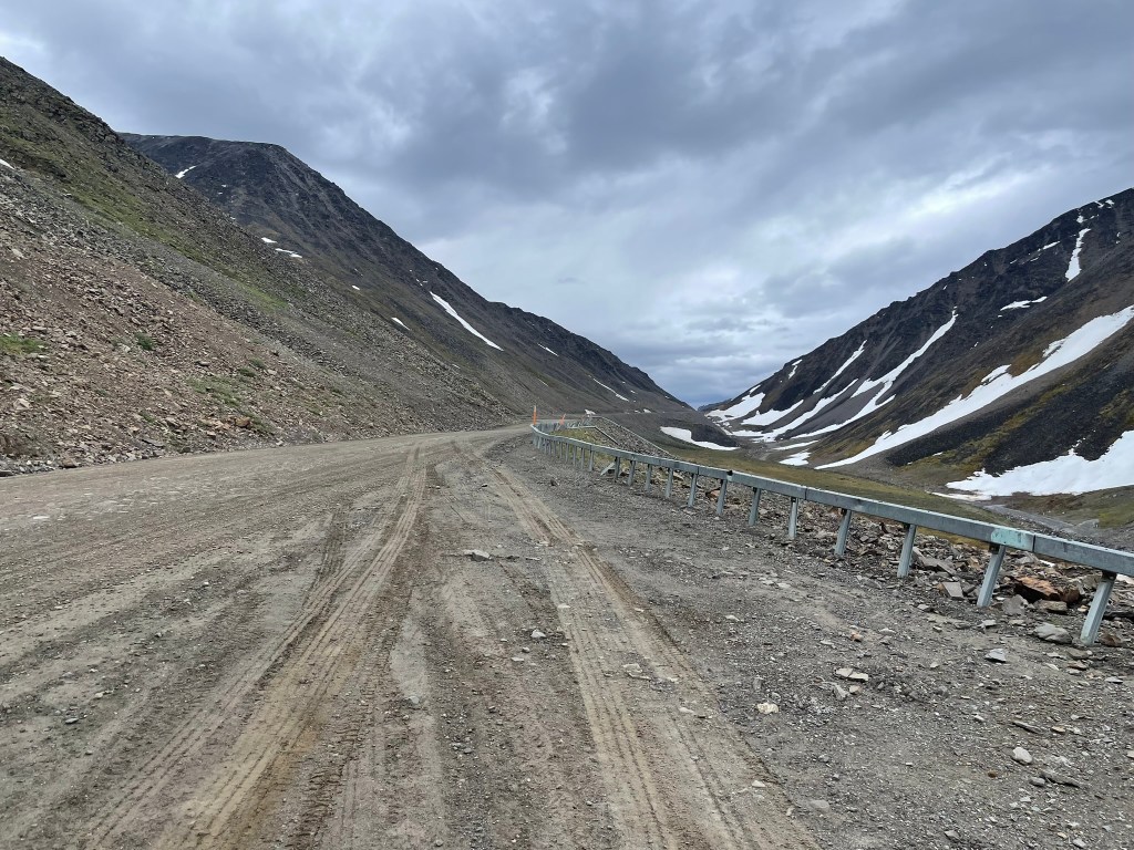 Soon enough, we approach Atigun Pass. We ride for a long time along the valley floor between two sets of peaks in the Brooks Mountain Range. The landscape is changing, but it’s a tundra, so not huge trees and forest, but meadows and shrubs, where there is any vegetation. We can see the road up Atigun in the distance, and it’s a bit thrilling thinking of the climb. The pass is not terribly long, nor terribly high at 4700 feet, but it’s all dirt and gravel, and it’s dicey going up and down 11-12% grades on loose roadway. The temp drops, and the one time we stop for a pic lets us know we got lucky in how/where we stopped, as getting our big bikes rolling again up that steep grade is challenging. The pass is grand, but stark. There is snow on some peaks, but not much is growing here. We see a few trucks and this is clearly a place they know they must go slowly and in low gears. Their climb is high stakes, and even a wet surface means they may have to put chains on their tires to gain traction. Any doubt we had about switching to dirt tires is answered here. As we descend, it’s almost disappointing that the challenge is over, but we’ll see it again the next day.