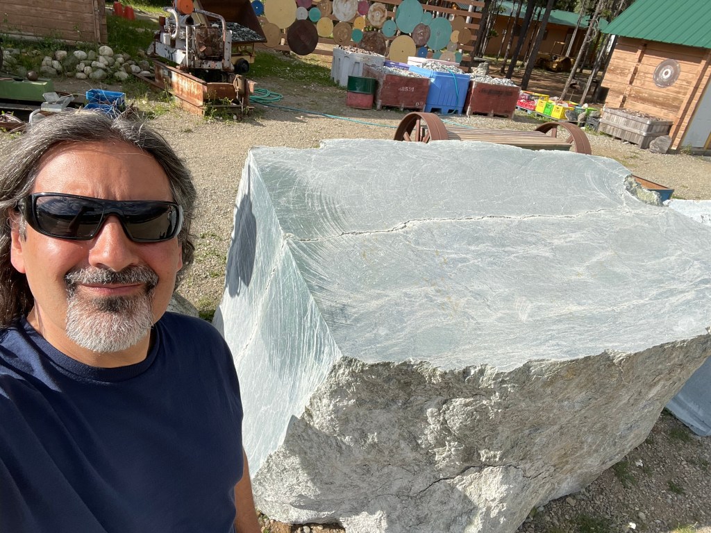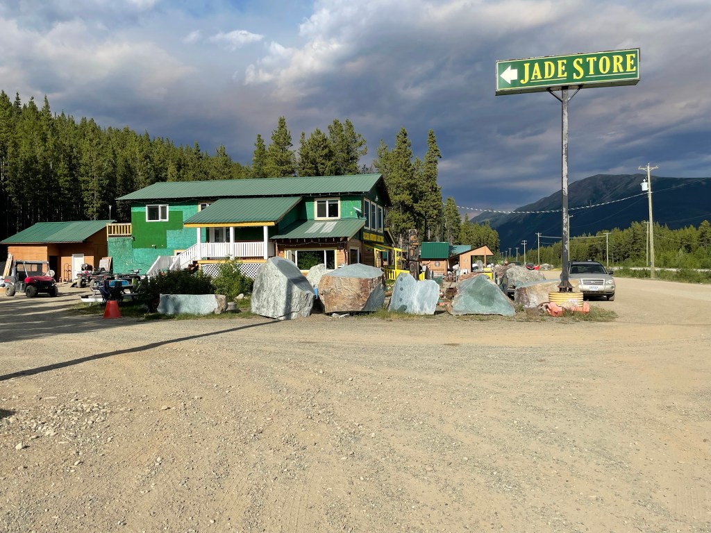Jade City appears to be a gradually built accumulation of various businesses – each to answer a specific demand or exploit a local resource. There is a jade mine nearby, so there is an operation cutting, shaping and polishing various jade pieces, 90% of which are shipped off to China. It is so bountiful here that the large boulders separating the parking lot from the buildings are jade. In its raw form, it barely hints at the inner beauty, mostly looking like vaguely green granite. Another business offers free overnight space to RV’s, perhaps in the hope they will buy jade or wifi access. We each take one of 4 rooms they have built from an old construction trailer. The room is clean and tidy, but the door just clears the bed, and the bed just clears the interior walls. There isn’t room for the one chair to remain inside, if we are to put our luggage in the room. Our morning workout is done individually, in the one area of each room that isn’t taken up by the bed. Still, I am happy for the peace of alone time when I close the door at night, after having a stogie while ash falls from the sky. Trippy.